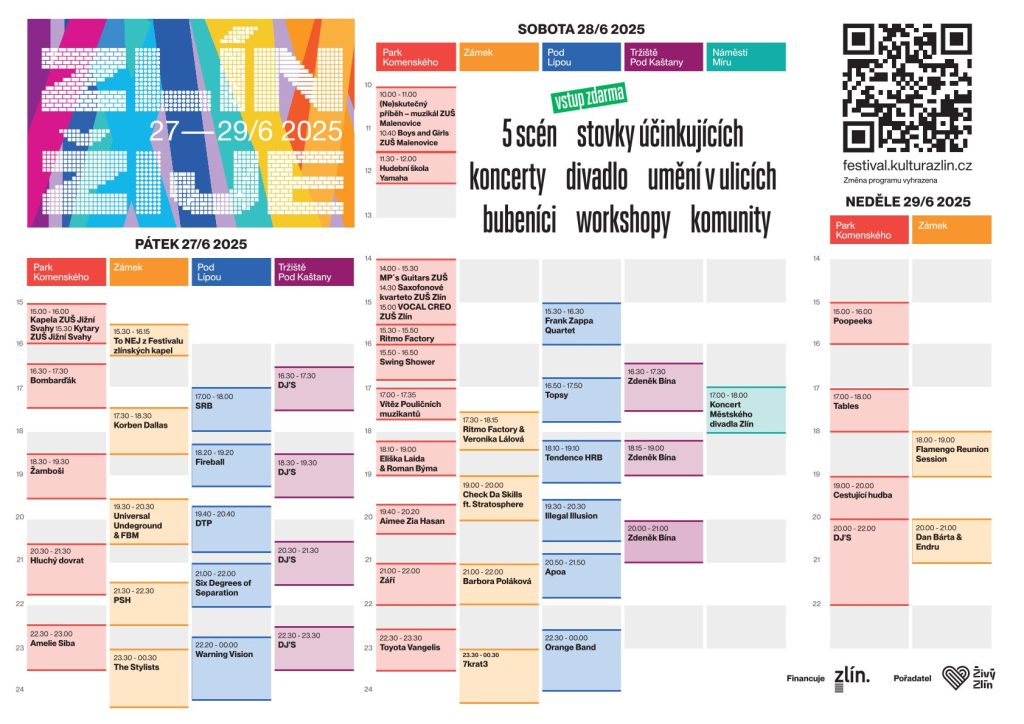Tři dny nabité muzikou, pouličním uměním a setkáváním slibuje čtvrtý ročník největšího zlínského multižánrového festivalu Zlín žije, který se koná v srdci krajského města ve dnech 27. – 29. června 2025. Přijďte oslavit vysvědčení a odstartovat začátek prázdnin! Potkáme se u zámku, v parku Komenského, v parčíku Pod Lípou, na náměstí Míru nebo na Tržišti Pod Kaštany? Vstup je volný. Akci financuje město Zlín a pořádá ji kulturní a kreativní centrum Živý Zlín.