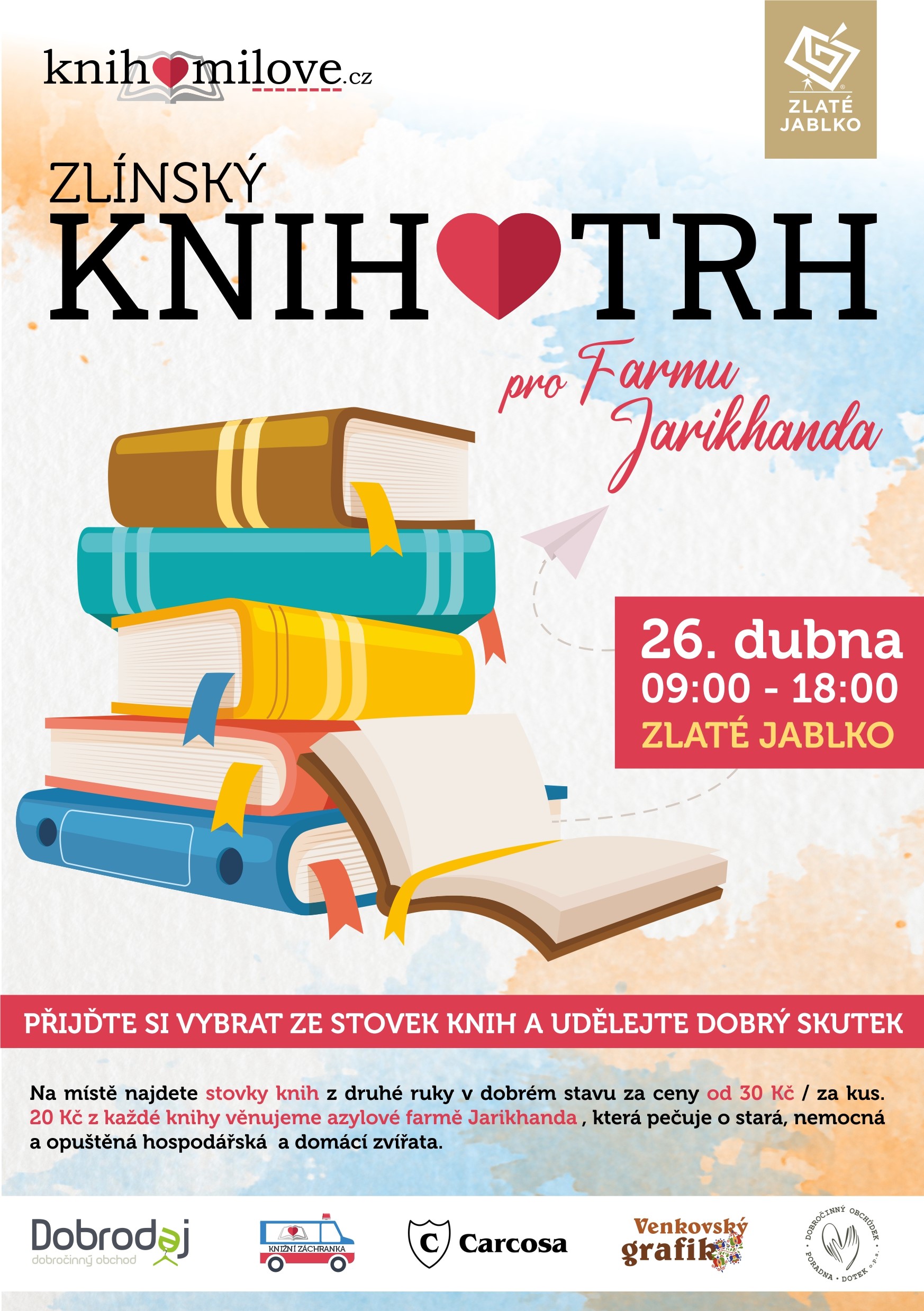 V jeden velký KnihoTrh se promění přízemí obchodního a zábavního centra Zlaté jablko ve Zlíně. V pátek 26. dubna zde budou k mání stovky knih v dobrém stavu za ceny už od 30 korun. A protože jedná o charitativní akci, 20 korun z prodeje každé knihy bude věnováno na dobrou věc. Výtěžek z prodeje tentokrát získá azylová farma Jarikhanda v Březůvkách, ve které našla domov stará, nemocná a opuštěná hospodářská zvířata.Kromě této dobročinné stránky má nákup použitých knih i další výhody. Může být zážitkem spojeným s objevováním – často zde lze získat knihy, které v knihkupectvích už dávno nejsou k dostání. A roli tu hraje i udržitelnost, kdy pro jednoho nepotřebná kniha může pro jiného ještě znamenat radost i užitek.