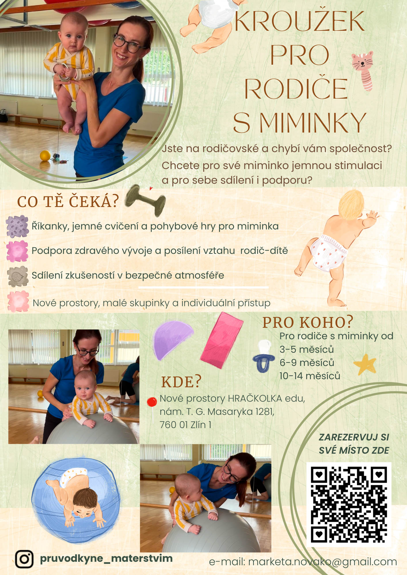 Lekce probíhají s respektem k individuálnímu tempu každého miminka i potřebám celé rodiny. Cvičení má hravou a laskavou formu, pohyb je doprovázen říkankami, zpěvem a hrou na jednoduché hudební nástroje. Rodiče si z kurzu odnesou nejen příjemný společný zážitek, ale také mnoho praktických tipů a inspirace, které mohou snadno využít i v domácím prostředí.Kurz se skládá z 10 lekcí. Každá lekce trvá 45 minut + 15 minut v relaxační místnosti. Max kapacita 5 dětí.