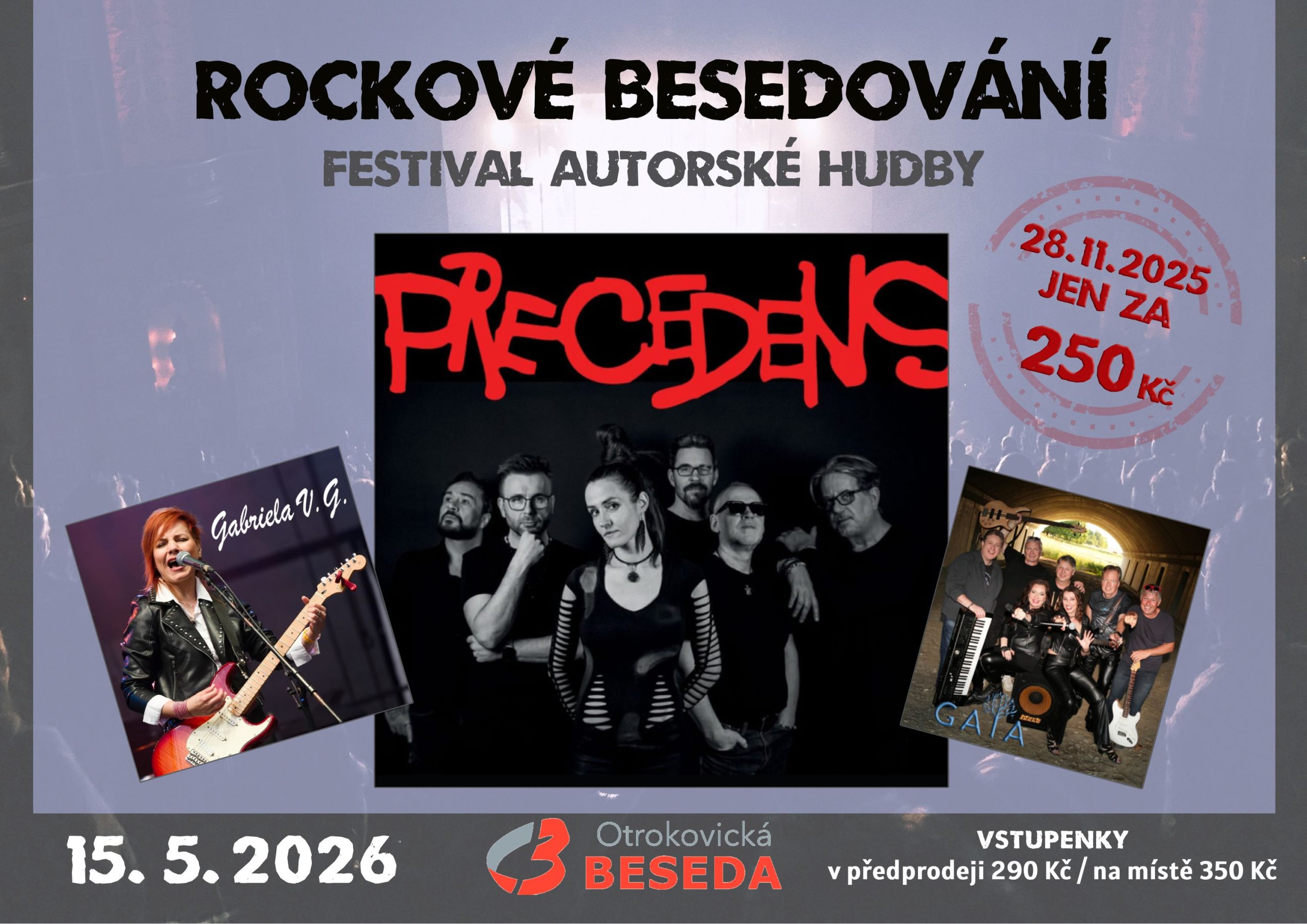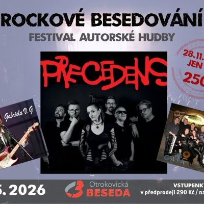 Trojkoncert kapel PRECEDENS, GAIA a Gabriela V.G. Toto hudební setkání se uskuteční v rámci minifestivalu Rockové besedování. Nenechte si tuhle jedinečnou akci ujít. 15. 5. 2026 (17:00)