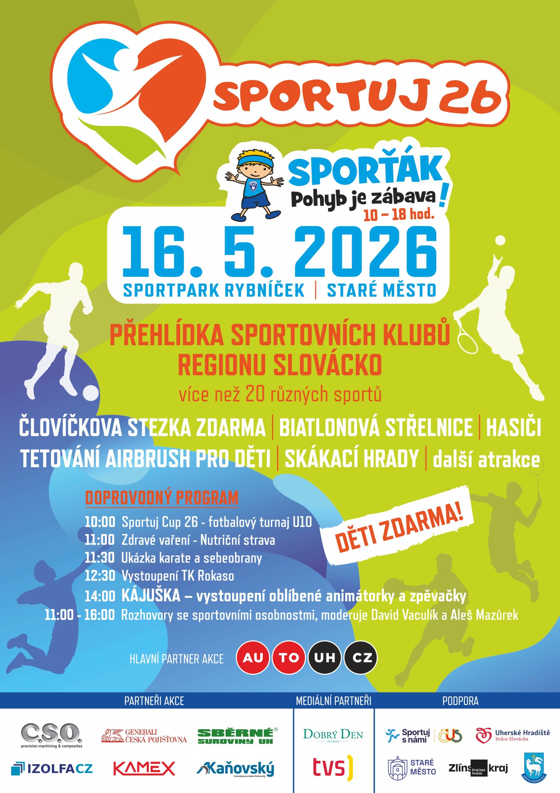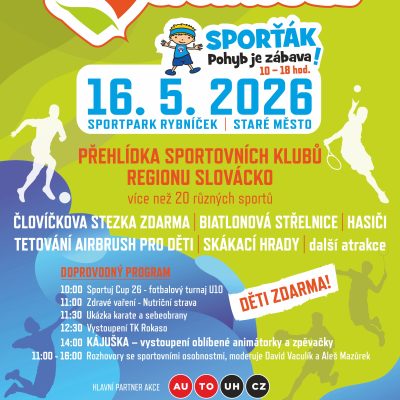 V sobotu 16. května ožije Sportpark Rybníček ve všech svých prostorách radostí a pohybem. Na festivalu se budou prezentovat spolky a sportovní kluby celého regionu Slovácko. Děti budou mít možnost vyzkoušet si a vybrat ten sport, který je nejvíc baví, rodiče se na místě budou moct zeptat trenérů na vše, co je zajímá. V ideálním případě si děti rovnou odnesou přihlášku do vysněného sportovního klubu.