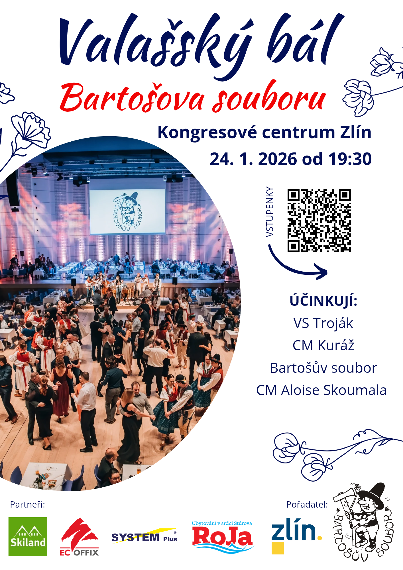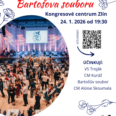 I v roce 2026 Vás mile rádi uvítáme v Kongresovém centru ve Zlíně na oblíbeném Valašském bále Bartošova souboru, který se bude konat v tradičním lednovém termínu.Letos budeme opět pokračovat v pravidelném střídání hostů z Valašska a Slovácka. Tentokrát se představí Valašský soubor Troják z Valašské Bystřice za doporvodu své cimbálové muziky. K tanci a poslechu bude hrát také další host, Cimbálová muzika Kuráž z Liptálu, a samozřejmě domácí Cimbálová muzika Aloise Skoumala.
