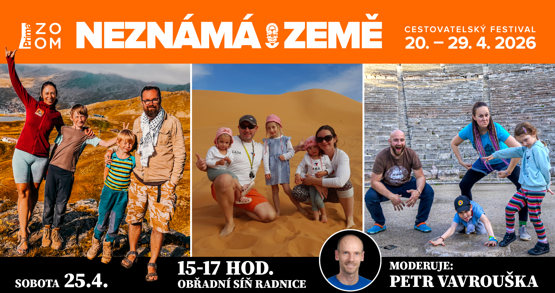 Jaké to je vzít děti a vyrazit na měsíce na cestu? Ne jako jet dovolenou, ale jako způsob života. Bez jistoty, bez pevného plánu – a často i mimo komfortní zónu. Na workshopu se setkáte se třemi rodinami, které to žijí. Bezděkovi (Big Trip), Arvayovi (Hilux with 2 kids overlanding) a Remišovi (Overland festival) se podělí o své zkušenosti z dlouhých cest – otevřeně, bez idealizování. Jak zvládají školu, vztahy i každodenní fungování na cestách? Co jim to dává – a co je to stojí? Součástí bude i společná diskuze, do které se můžete zapojit. Moderuje Petr Vavrouška.