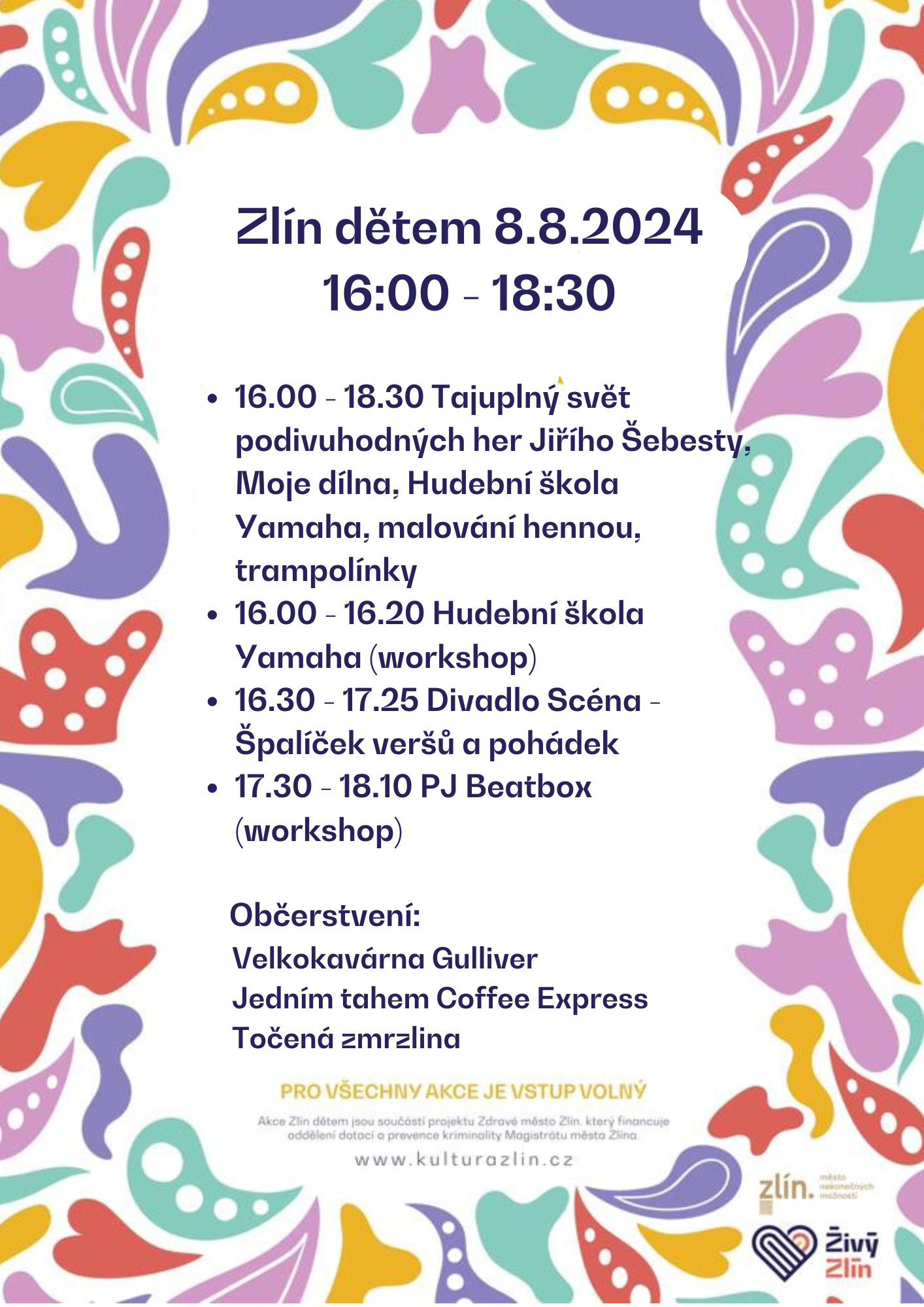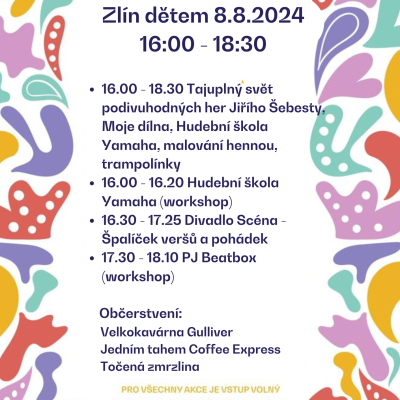 16.00 - 18.30 Tajuplný svět podivuhodných her Jiřího Šebesty, Moje dílna, Hudební škola Yamaha, malování hennou, trampolínky, malování na obličej, stánek Živého Zlína